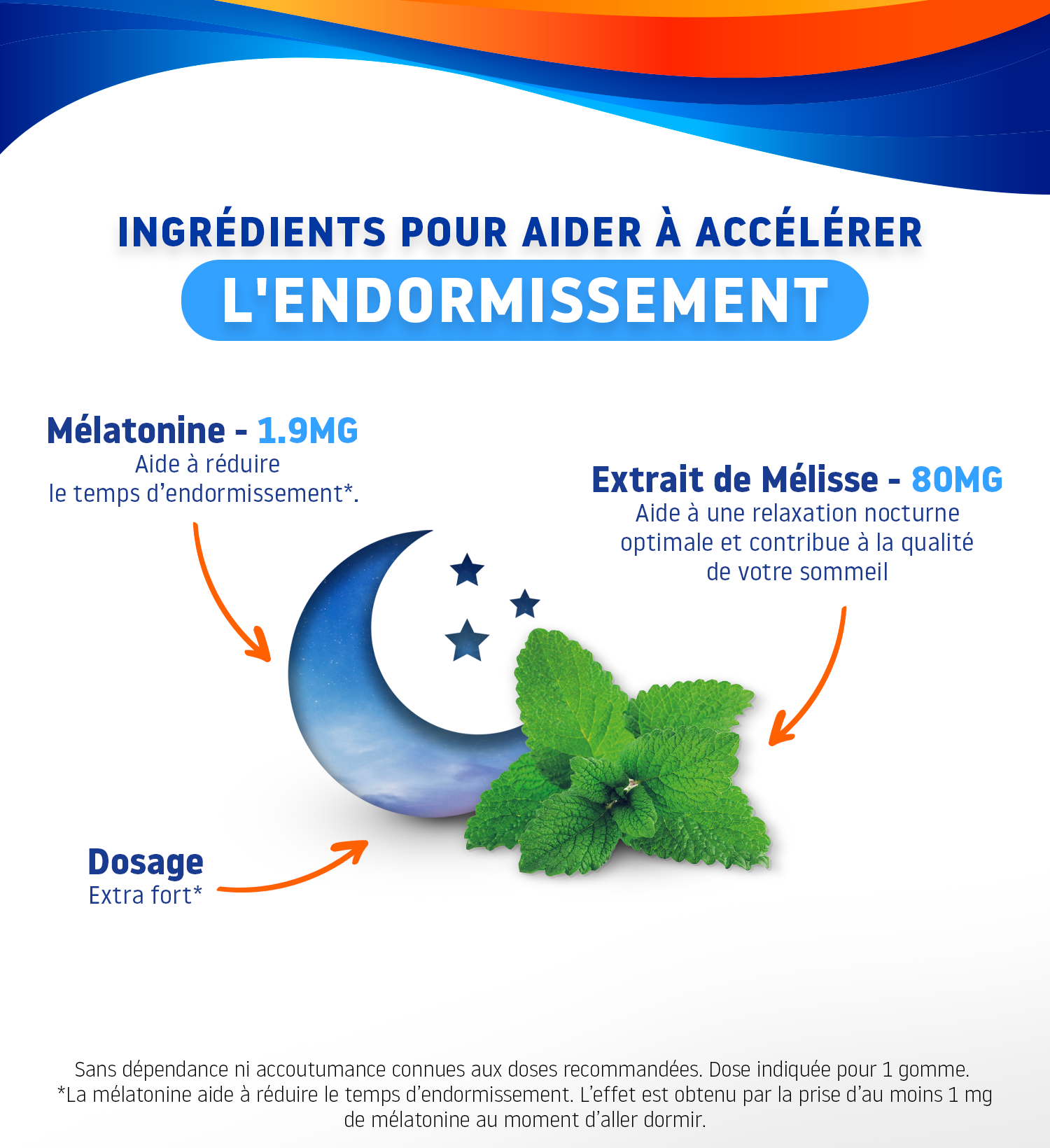 - Mélatonine 1,9 mg : aide à réduire le temps d'endormissement. L'effet est obtenu par la prise d'au moins 1 mg de mélatonine au moment d'aller dormir.